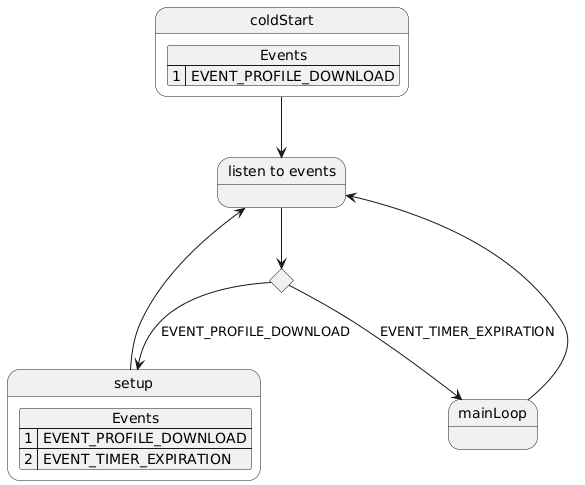 @startuml state coldStart { 'I just want a single column table here map Events { 1 => EVENT_PROFILE_DOWNLOAD } } state "listen to events" as listen state eventChoice <<choice>> coldStart --> listen setup --> listen mainLoop --> listen listen --> eventChoice eventChoice --> setup: EVENT_PROFILE_DOWNLOAD eventChoice --> mainLoop: EVENT_TIMER_EXPIRATION state setup { 'I just want a single column table here map "Events" as SetupEvents { 1 => EVENT_PROFILE_DOWNLOAD 2 => EVENT_TIMER_EXPIRATION } } state mainLoop { } @enduml