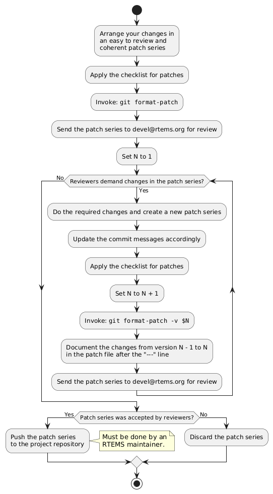 @startuml start :Arrange your changes in\nan easy to review and\ncoherent patch series; :Apply the checklist for patches; :Invoke: ""git format-patch""; :Send the patch series to devel@rtems.org for review; :Set N to 1; while (Reviewers demand changes in the patch series?) is (Yes) :Do the required changes and create a new patch series; :Update the commit messages accordingly; :Apply the checklist for patches; :Set N to N + 1; :Invoke: ""git format-patch -v $N""; :Document the changes from version N - 1 to N\nin the patch file after the "---" line; :Send the patch series to devel@rtems.org for review; endwhile (No) if (Patch series was accepted by reviewers?) then (Yes) :Push the patch series\nto the project repository; note right Must be done by an RTEMS maintainer. end note else (No) :Discard the patch series; endif stop @enduml