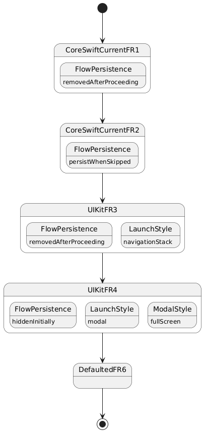 @startuml state CoreSwiftCurrentFR1 { state "FlowPersistence" as CoreSwiftCurrentFR1.FlowPersistence : removedAfterProceeding } state CoreSwiftCurrentFR2 { state "FlowPersistence" as CoreSwiftCurrentFR2.FlowPersistence : persistWhenSkipped } state UIKitFR3 { state "FlowPersistence" as UIKitFR3.FlowPersistence : removedAfterProceeding state "LaunchStyle" as UIKitFR3.LaunchStyle : navigationStack } state UIKitFR4 { state "FlowPersistence" as UIKitFR4.FlowPersistence : hiddenInitially state "LaunchStyle" as UIKitFR4.LaunchStyle { state "ModalStyle" as UIKitFR4.ModalStyle : fullScreen } UIKitFR4.LaunchStyle : modal } [*] --> CoreSwiftCurrentFR1 CoreSwiftCurrentFR1 --> CoreSwiftCurrentFR2 CoreSwiftCurrentFR2 --> UIKitFR3 UIKitFR3 --> UIKitFR4 UIKitFR4 --> DefaultedFR6 DefaultedFR6 --> [*] @enduml