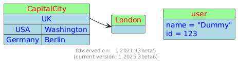 @startuml <style> map { BackGroundColor lightblue FontColor blue } object { BackGroundColor lightblue FontColor blue } header { BackGroundColor palegreen FontColor red } </style> object London map CapitalCity { UK *-> London USA => Washington Germany => Berlin } object user { name = "Dummy" id = 123 } footer Observed on: 1.2021.13beta5\n(current version: %version()) @enduml