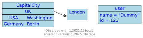 @startuml <style> header { BackGroundColor palegreen FontColor red } map { BackGroundColor lightblue FontColor blue } object { BackGroundColor lightblue FontColor blue } </style> object London map CapitalCity { UK *-> London USA => Washington Germany => Berlin } object user { name = "Dummy" id = 123 } footer Observed on: 1.2021.13beta5\n(current version: %version()) @enduml