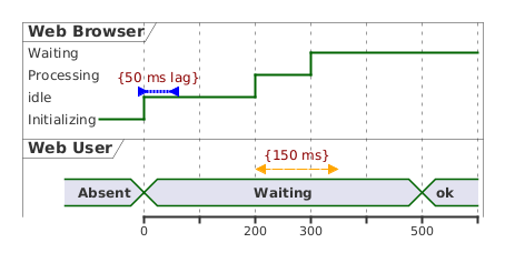 @startuml <style> timingDiagram { constraintArrow { LineStyle 2-1 LineThickness 3 LineColor Blue } } </style> robust "Web Browser" as WB concise "Web User" as WU WB is Initializing WU is Absent @WB 0 is idle +200 is Processing +100 is Waiting WB@0 <-> @50 : {50 ms lag} <style> timingDiagram { constraintArrow { LineStyle 10-1 LineThickness 1 LineColor #orange } } </style> @WU 0 is Waiting +500 is ok @200 <-> @+150 : {150 ms} @enduml
