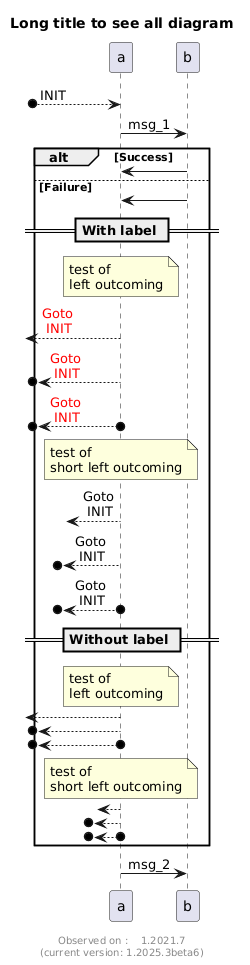 @startuml title Long title to see all diagram footer \nObserved on : 1.2021.7\n(current version: %version()) [o--> a : INIT a->b: msg_1 alt Success a<-b else Failure a<-b == With label == note over a : test of\nleft outcoming [<-- a : <color:red>Goto\n<color:red> INIT [o<-- a : <color:red>Goto\n<color:red> INIT [o<--o a : <color:red>Goto\n<color:red> INIT note over a : test of\nshort left outcoming ?<-- a : Goto\n INIT ?o<-- a : Goto\n INIT ?o<--o a : Goto\n INIT == Without label == note over a : test of\nleft outcoming [<-- a : [o<-- a : [o<--o a : note over a : test of\nshort left outcoming ?<-- a : ?o<-- a : ?o<--o a : end a->b: msg_2 @enduml