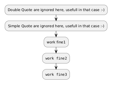 @startuml !define TT(x) ""x"" !define E(stmt) :stmt; E("Double Quote are ignored here, usefull in that case :-)") E('Simple Quote are ignored here, usefull in that case :-)') E(work fine1) E('""work fine2""') E('TT(work fine3)') @enduml