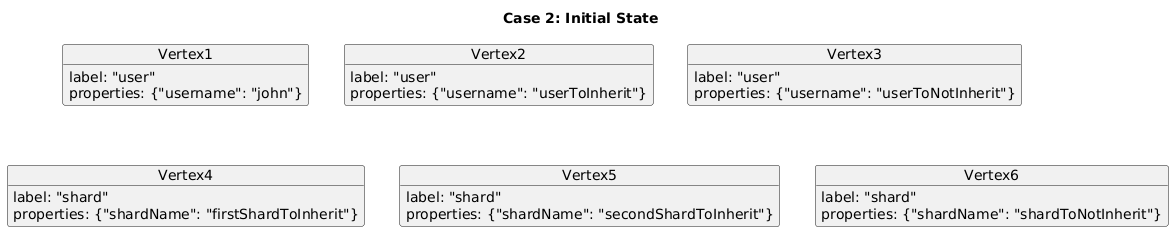 @startuml title Case 2: Initial State object Vertex1 { label: "user" properties: {"username": "john"} } object Vertex2 { label: "user" properties: {"username": "userToInherit"} } object Vertex3 { label: "user" properties: {"username": "userToNotInherit"} } object Vertex4 { label: "shard" properties: {"shardName": "firstShardToInherit"} } object Vertex5 { label: "shard" properties: {"shardName": "secondShardToInherit"} } object Vertex6 { label: "shard" properties: {"shardName": "shardToNotInherit"} } @enduml