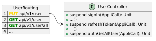 @startuml hide empty members Class UserController { + suspend signIn(AppliCall): Unit + ...() + suspend refreshToken(AppliCall): Unit + ...() + suspend authGetAllUser(AppliCall): Unit } map UserRouting { 1 => <font color=gold><b>PUT</b></font> api/v1/user 2 => <font color=green><b>GET</b></font> api/v1/user 3 => <font color=green><b>GET</b></font> api/v1/user/all 4 => ... } UserRouting::1 -> UserController::refreshToken @enduml