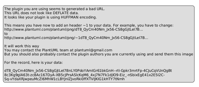 @startuml legend The plugin you are using seems to generated a bad URL. This URL does not look like DEFLATE data. It looks like your plugin is using HUFFMAN encoding. This means you have now to add an header ~1 to your data. For example, you have to change: http://www.plantuml.com/plantuml/png/dT8_QyCm40Nm_Jx56-CS8gGjtLeI7B... to http://www.plantuml.com/plantuml/png/~1dT8_QyCm40Nm_Jx56-CS8gGjtLeI7B... It will work this way You may contact the PlantUML team at plantuml@gmail.com But you should also probably contact the plugin authors you are currently using and send them this image For the record, here is your data: dT8_QyCm40Nm_Jx56-CS8gGjtLeI7BnLY0PdoYAmIGr61bkGnH--rIl-Gpkr3mrtFp-4CJuCqVUnQgBt 8c3Kg9glA63t-zc8Ac167DyA-XB5cJPrsASlcKqM6_4xj7N7Fk1djlO9-Eiz_-nSbixEgE41x2E5I2C- Sq-vYdaXRjwpeuMcZI6MhW1cLBYJnIZJvoRki0ffXTVlJKIG1kHTY7tNmh endlegend @enduml