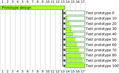 @startgantt <style> ganttDiagram { unstartedTask { BackGroundColor Fuchsia LineColor FireBrick } task { BackGroundColor GreenYellow LineColor Green } } </style> [Prototype design] lasts 13 days [Test prototype 0] lasts 4 days [Test prototype 10] lasts 4 days [Test prototype 20] lasts 4 days [Test prototype 30] lasts 4 days [Test prototype 40] lasts 4 days [Test prototype 50] lasts 4 days [Test prototype 60] lasts 4 days [Test prototype 70] lasts 4 days [Test prototype 80] lasts 4 days [Test prototype 90] lasts 4 days [Test prototype 100] lasts 4 days [Test prototype 0] starts at [Prototype design]'s end [Test prototype 10] starts at [Prototype design]'s end [Test prototype 20] starts at [Prototype design]'s end [Test prototype 30] starts at [Prototype design]'s end [Test prototype 40] starts at [Prototype design]'s end [Test prototype 50] starts at [Prototype design]'s end [Test prototype 60] starts at [Prototype design]'s end [Test prototype 70] starts at [Prototype design]'s end [Test prototype 80] starts at [Prototype design]'s end [Test prototype 90] starts at [Prototype design]'s end [Test prototype 100] starts at [Prototype design]'s end [Test prototype 0] is 0% complete [Test prototype 10] is 10% complete [Test prototype 20] is 20% complete [Test prototype 30] is 30% complete [Test prototype 40] is 40% complete [Test prototype 50] is 50% complete [Test prototype 60] is 60% complete [Test prototype 70] is 70% complete [Test prototype 80] is 80% complete [Test prototype 90] is 90% complete [Test prototype 100] is 100% complete @endgantt