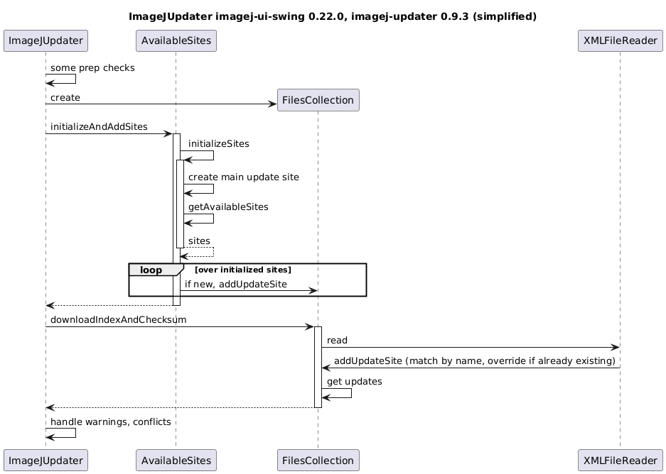 @startuml title ImageJUpdater imagej-ui-swing 0.22.0, imagej-updater 0.9.3 (simplified) ImageJUpdater -> ImageJUpdater : some prep checks participant AvailableSites create FilesCollection ImageJUpdater -> FilesCollection : create ImageJUpdater -> AvailableSites : initializeAndAddSites activate AvailableSites AvailableSites -> AvailableSites : initializeSites activate AvailableSites AvailableSites -> AvailableSites : create main update site AvailableSites -> AvailableSites : getAvailableSites return sites loop over initialized sites AvailableSites -> FilesCollection : if new, addUpdateSite end return ImageJUpdater -> FilesCollection : downloadIndexAndChecksum activate FilesCollection FilesCollection -> XMLFileReader : read XMLFileReader -> FilesCollection : addUpdateSite (match by name, override if already existing) FilesCollection -> FilesCollection : get updates return ImageJUpdater -> ImageJUpdater : handle warnings, conflicts @enduml