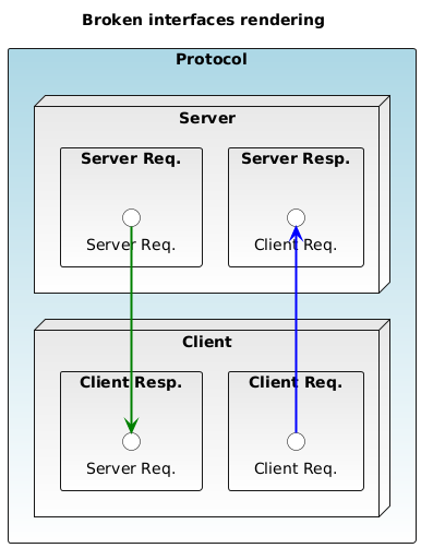 @startuml skinparam defaultFontName Helvetica skinparam noteBackgroundColor White skinparam legendBackgroundColor White skinparam noteBorderColor Gray top to bottom direction skinparam linetype ortho skinparam arrowThickness 2 skinparam interface { backgroundColor White borderColor Black } skinparam queue { backgroundColor White borderColor Black } skinparam boundary { backgroundColor White borderColor Black } skinparam control { backgroundColor White borderColor Black } skinparam entity { backgroundColor White borderColor Black } skinparam actor { borderColor Black } skinparam cloud { borderColor Gray } skinparam arrow { color gray } title Broken interfaces rendering rectangle "Protocol" as protocol #LightBlue-White { node "Server" as server_component #E8E8E8-White { rectangle "Server Req." as serverRequest #E8E8E8-White { circle "Server Req." as serverRequest_at_SERVER_REQUESTS } rectangle "Server Resp." as serverResponse #E8E8E8-White { circle "Client Req." as serverResponse_at_DATA_SYNC } } node "Client" as client_component #E8E8E8-White { rectangle "Client Resp." as clientResponse #E8E8E8-White { circle "Server Req." as clientResponse_at_SERVER_REQUESTS } rectangle "Client Req." as clientRequest #E8E8E8-White { circle "Client Req." as clientRequest_at_DATA_SYNC } } } serverRequest_at_SERVER_REQUESTS -[#green]-> clientResponse_at_SERVER_REQUESTS serverResponse_at_DATA_SYNC <-[#blue]- clientRequest_at_DATA_SYNC @enduml