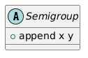 @startuml abstract class Semigroup [[http://gusty.github.io/FSharpPlus/abstraction-semigroup.html]] { + append x y [[[http://gusty.github.io/FSharpPlus/abstraction-semigroup.html#mappend {Appends two semigroups} ]]] } @enduml