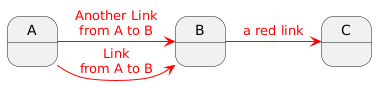 @startuml <style> stateDiagram { arrow { FontSize 13 LineColor Blue FontColor Blue } } </style> state A state B state C A -> B : Link\nfrom A to B <style> stateDiagram { arrow { FontSize 13 LineColor Red FontColor Red } } </style> A -> B : Another Link\nfrom A to B B -> C : a red link @enduml
