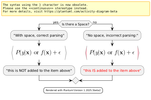 @startuml skinparam Backgroundcolor transparent legend <size:8> Rendered with Plantuml Version %version() </size> end legend if (Is there a Space?) then (yes) :"With space, correct parsing"; :<latex>P(y|\mathbf{x}) \mbox{ or } f(\mathbf{x})+\epsilon</latex> } :"this is NOT added to the item above"; else (no) :"No space, incorrect parsing:"; #pink:<latex>P(y|\mathbf{x}) \mbox{ or } f(\mathbf{x})+\epsilon</latex>} :<color:red>"this IS added to the item above"; endif @enduml