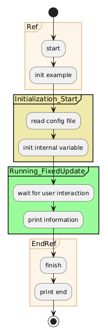 @startuml skinparam partition { BackgroundColor OldLace BackgroundColor<<Start>> PaleGoldenRod BackgroundColor<<FixedUpdate>> PaleGreen BorderColor BurlyWood BorderColor<<Start>> Black BorderColor<<FixedUpdate>> Black BorderStyle Dashed BorderStyle<<Start>> Solid ' This is not applied to the partitions tagged with Start. Why? BorderStyle<<FixedUpdate>> Solid ' This is not applied to the partitions tagged with FixedUpdate. Why? } start partition Ref { :start; :init example; } partition Initialization_Start <<Start>>{ :read config file; :init internal variable; } partition Running_FixedUpdate <<FixedUpdate>>{ :wait for user interaction; :print information; } partition EndRef { :finish; :print end; } stop @enduml