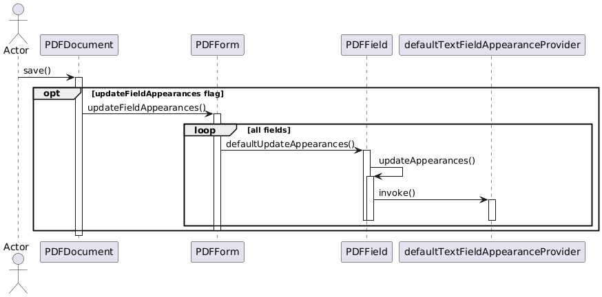 @startuml actor Actor Actor -> PDFDocument: save() activate PDFDocument opt updateFieldAppearances flag PDFDocument -> PDFForm: updateFieldAppearances() activate PDFForm loop all fields PDFForm -> PDFField: defaultUpdateAppearances() activate PDFField PDFField -> PDFField: updateAppearances() activate PDFField PDFField -> defaultTextFieldAppearanceProvider : invoke() activate defaultTextFieldAppearanceProvider deactivate defaultTextFieldAppearanceProvider deactivate PDFField deactivate PDFField end deactivate PDFForm end deactivate PDFDocument @enduml