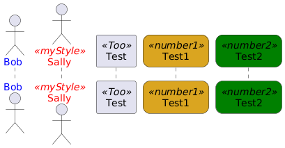 @startuml skinparam useBetaStyle true ' style enclosure declaration <style> ' scope to sequenceDiagram elements sequenceDiagram { ' scope to actor element types actor { FontColor Blue } ' define a new style, using CSS class syntax .myStyle { FontColor Red } ' define a new style, using CSS class syntax .number1 { BackgroundColor #GoldenRod RoundCorner 20 ShowStereotype true } ' define a new style, using CSS class syntax .number2 { BackgroundColor #Green RoundCorner 20 } } } </style> ' printed in blue actor Bob ' this will now be printed in Red actor Sally <<myStyle>> participant Test <<Too>> participant Test1 <<number1>> participant Test2 <<number2>> @enduml