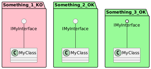 @startuml skinparam BackgroundColor transparent namespace Something_1_KO #pink { class MyClass circle IMyInterface IMyInterface -- MyClass } namespace Something_2_OK #palegreen { class MyClass () IMyInterface IMyInterface -- MyClass } namespace Something_3_OK #palegreen { class MyClass IMyInterface ()-- MyClass } @enduml