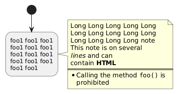 @startuml <style> activityDiagram { activity { MaximumWidth 100 } note { MaximumWidth 200 } } </style> start :foo1 foo1 foo1 foo1 foo1 foo1 foo1 foo1 foo1 foo1 foo1 foo1 foo1 foo1; note right Long Long Long Long Long Long Long Long Long Long Long Long Long Long note This note is on several //lines// and can contain <b>HTML</b> ==== * Calling the method ""foo()"" is prohibited end note 'floating note left: This is a Long Long Long Long Long Long Long Long Long Long Long Long Long Long note @enduml