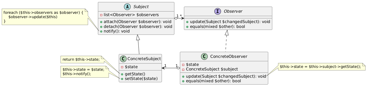@startuml top to bottom direction abstract Subject { -list<Observer> $observers +attach(Observer $observer): void +detach(Observer $observer): void +notify(): void } note left of Subject::notify foreach ($this->observers as $observer) { $observer->update($this) } end note interface Observer { +update(Subject $changedSubject): void +equals(mixed $other): bool } class ConcreteSubject extends Subject { -$state +getState() +setState($state) } note left of ConcreteSubject::getState return $this->state; end note note left of ConcreteSubject::setState $this->state = $state; $this->notify(); end note class ConcreteObserver implements Observer { -$state -ConcreteSubject $subject +update(Subject $changedSubject): void +equals(mixed $other): bool } note right of ConcreteObserver::update $this->state = $this->subject->getState(); end note Subject "1" o-right-> "*" Observer ConcreteObserver "1" o-left-> "1" ConcreteSubject @enduml
