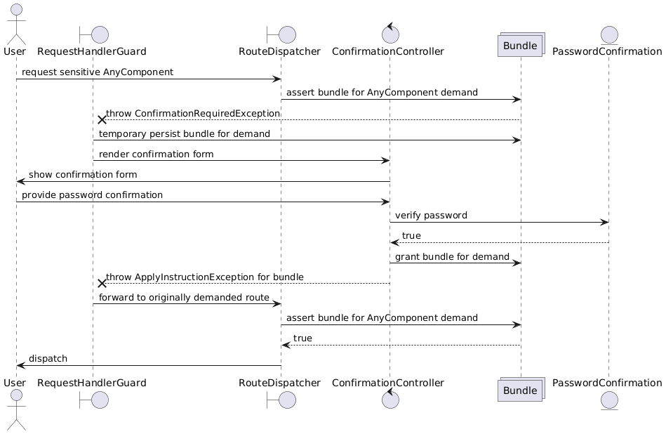 @startuml actor User boundary RequestHandlerGuard boundary RouteDispatcher control ConfirmationController collections Bundle entity PasswordConfirmation User -> RouteDispatcher : request sensitive AnyComponent RouteDispatcher -> Bundle : assert bundle for AnyComponent demand Bundle -->x RequestHandlerGuard : throw ConfirmationRequiredException RequestHandlerGuard -> Bundle : temporary persist bundle for demand RequestHandlerGuard -> ConfirmationController : render confirmation form ConfirmationController -> User : show confirmation form User -> ConfirmationController : provide password confirmation ConfirmationController -> PasswordConfirmation : verify password PasswordConfirmation --> ConfirmationController : true ConfirmationController -> Bundle : grant bundle for demand ConfirmationController -->x RequestHandlerGuard : throw ApplyInstructionException for bundle RequestHandlerGuard -> RouteDispatcher : forward to originally demanded route RouteDispatcher -> Bundle : assert bundle for AnyComponent demand Bundle --> RouteDispatcher : true RouteDispatcher -> User : dispatch @enduml