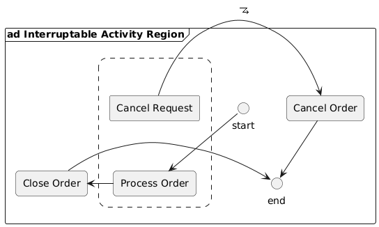 @startuml hide stereotype ''skinparam linetype ortho skinparam rectangle { roundCorner<<interruptable>> 25 roundCorner<<start>> 25 roundCorner<<process>> 10 backgroundColor<<start>> black } skinparam shadowing false sprite $interruptzigzag [16x16/16] { 0000000000000000 0000000000000000 0000000000000000 0000000000000000 000FFFFFFFFFFF00 000000000000F000 00000000000F0000 0000000000F00000 000000000F000F00 00000000F00000F0 0000000FFFFFFFFF 00000000000000F0 0000000000000F00 0000000000000000 0000000000000000 0000000000000000 } frame "ad Interruptable Activity Region" { rectangle " " <<interruptable>> #line.dashed { rectangle "Process Order" as process <<process>> rectangle "Cancel Request" as cancelreq } rectangle "Close Order" as close <<process>> rectangle "Cancel Order" as cancel <<process>> process -right-> close start -down-> process close -> end cancel --> end cancelreq -> cancel: <$interruptzigzag> '' layout cancelreq -[hidden]down-> process } @enduml