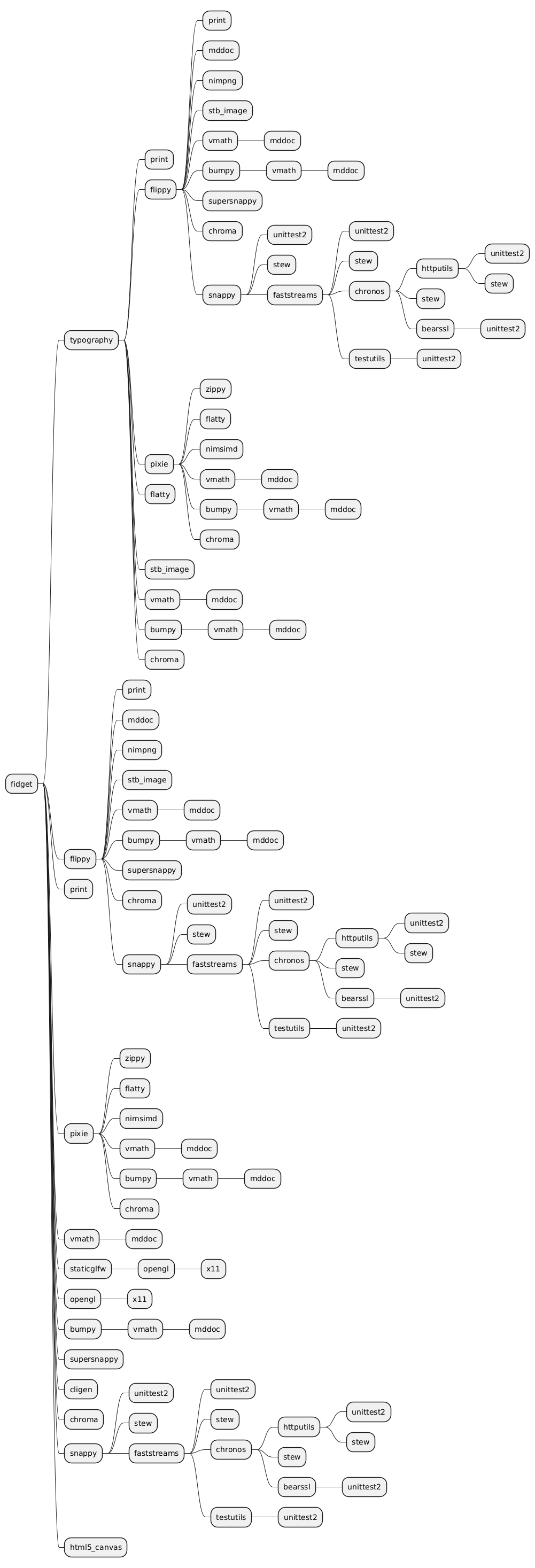 @startmindmap * fidget ** typography *** print *** flippy **** print **** mddoc **** nimpng **** stb_image **** vmath ***** mddoc **** bumpy ***** vmath ****** mddoc **** supersnappy **** chroma **** snappy ***** unittest2 ***** stew ***** faststreams ****** unittest2 ****** stew ****** chronos ******* httputils ******** unittest2 ******** stew ******* stew ******* bearssl ******** unittest2 ****** testutils ******* unittest2 *** pixie **** zippy **** flatty **** nimsimd **** vmath ***** mddoc **** bumpy ***** vmath ****** mddoc **** chroma *** flatty *** stb_image *** vmath **** mddoc *** bumpy **** vmath ***** mddoc *** chroma ** flippy *** print *** mddoc *** nimpng *** stb_image *** vmath **** mddoc *** bumpy **** vmath ***** mddoc *** supersnappy *** chroma *** snappy **** unittest2 **** stew **** faststreams ***** unittest2 ***** stew ***** chronos ****** httputils ******* unittest2 ******* stew ****** stew ****** bearssl ******* unittest2 ***** testutils ****** unittest2 ** print ** pixie *** zippy *** flatty *** nimsimd *** vmath **** mddoc *** bumpy **** vmath ***** mddoc *** chroma ** vmath *** mddoc ** staticglfw *** opengl **** x11 ** opengl *** x11 ** bumpy *** vmath **** mddoc ** supersnappy ** cligen ** chroma ** snappy *** unittest2 *** stew *** faststreams **** unittest2 **** stew **** chronos ***** httputils ****** unittest2 ****** stew ***** stew ***** bearssl ****** unittest2 **** testutils ***** unittest2 ** html5_canvas @endmindmapn