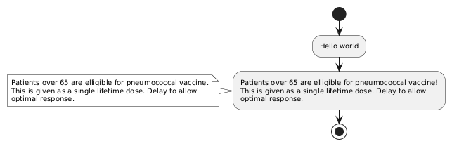 @startuml skinparam wrapWidth 300 skinparam ActivityFontSize 10 skinparam NoteFontSize 10 start :Hello world; :Patients over 65 are elligible for pneumococcal vaccine! This is given as a single lifetime dose. Delay to allow optimal response.; note left #white Patients over 65 are elligible for pneumococcal vaccine. This is given as a single lifetime dose. Delay to allow optimal response. end note stop @enduml