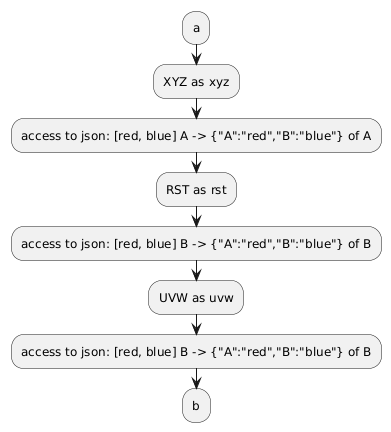 @startuml !$data={"partlen": "2", "game": "GamePlantuml", "participants": [ {"name": "XYZ" ,"as": "xyz", "team": "A"}, {"name": "RST" ,"as": "rst", "team": "B"}, {"name": "UVW" ,"as": "uvw", "team": "B"}], "color": {"A": "red", "B": "blue"} } :a; !foreach $part in $data.participants :$part.name as $part.as; :access to json: [$data.color.A, $data.color.B] $part.team -> $data.color of $part.team; ':access to json: [$data.color.A, $data.color.B] $part.team -> $data.color.%string($part.team); ':access to json: [$data.color.A, $data.color.B] $part.team -> $data.color[$part.team]; ':access to json: [$data.color.A, $data.color.B] $part.team -> $data.color.($part.team); ':access to json: [$data.color.A, $data.color.B] $part.team -> %get_variable_value($data.color,".",$part.team); !endfor :b; @enduml