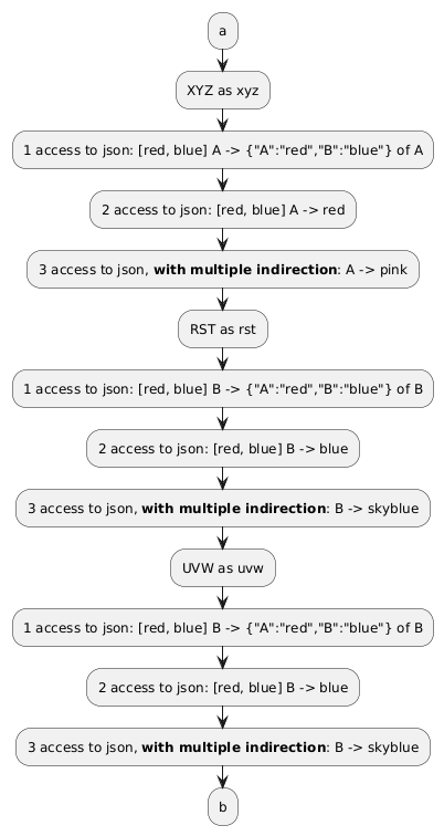 @startuml !$data={"partlen": "2", "game": "GamePlantuml", "participants": [ {"name": "XYZ" ,"as": "xyz", "team": "A"}, {"name": "RST" ,"as": "rst", "team": "B"}, {"name": "UVW" ,"as": "uvw", "team": "B"}], "color": {"A": "red", "B": "blue"}, "red": { "pure": "red", "paler": "pink"}, "blue": { "pure": "blue", "paler": "skyblue"} } :a; !foreach $part in $data.participants :$part.name as $part.as; :1 access to json: [$data.color.A, $data.color.B] $part.team -> $data.color of $part.team; :2 access to json: [$data.color.A, $data.color.B] $part.team -> $data.color[$part.team]; :3 access to json, **with multiple indirection**: $part.team -> $data[$data.color[$part.team]][paler]; !endfor :b; @enduml