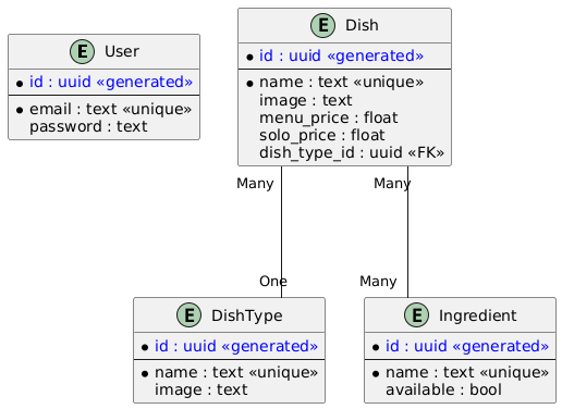 @startuml !function $generated($a) !return "<color:#0000ff>" + $a + " <<generated>></color>" !endfunction ' avoid problems with angled crows feet skinparam linetype ortho entity "User" as users { *$generated("id : uuid") -- *email : text <<unique>> password : text } entity "DishType" as dish_type { *$generated("id : uuid") -- *name : text <<unique>> image : text } entity "Dish" as dish { *$generated("id : uuid") -- *name : text <<unique>> image : text menu_price : float solo_price : float dish_type_id : uuid <<FK>> } entity "Ingredient" as ingredient { *$generated("id : uuid") -- *name : text <<unique>> available : bool } dish "Many" --- "One" dish_type dish "Many" --- "Many" ingredient @enduml