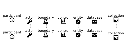 @startuml skinparam shadowing false skinparam participant { Bordercolor none Backgroundcolor none Shadowing false } skinparam actor { Bordercolor none Backgroundcolor none Shadowing false } skinparam boundary { Bordercolor none Backgroundcolor none Shadowing false } skinparam control { Bordercolor none Backgroundcolor none Shadowing false } skinparam entity { Bordercolor none Backgroundcolor none Shadowing false } skinparam database { Bordercolor none Backgroundcolor none Shadowing false } skinparam collections { Bordercolor none Backgroundcolor none Shadowing false } participant "participant\n<size:30><&clock>" as participant actor "actor\n<size:30><&key>" as actor boundary "boundary\n<size:30><&beaker>" as boundary control "control\n<size:30><&bar-chart>" as control entity "entity\n<size:30><&circle-check>" as entity database "database\n<size:30><&envelope-closed>" as database collections "collection\n<size:30><&image>" as collections @enduml