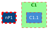 @startuml skinparam rectangle<<person>> { StereotypeFontColor #FFFFFF FontColor #FFFFFF BackgroundColor #08427B BorderColor #073B6F ' changed border styles via skinparam BorderColor red BorderThickness 5.0 BorderStyle dashed } skinparam rectangle<<container>> { StereotypeFontColor #FFFFFF FontColor #FFFFFF BackgroundColor #438DD5 } ' line (border) style can be changed via skinparam rectangle "nP1" <<person>> as P1 rectangle "C1" <<container>> as c1 #palegreen;line:red;line.dashed;text:green { ' line (==border) can be styled (dashed) rectangle "C1.1" <<container>> as C1.1 #line:red;line.dashed ' but how can I change the line (border) thickness, following 3 are not working ' rectangle "C1.2" <<container>> as C1.2 #line:red;line.dashed;line.thickness:5 ' rectangle "C1.2" <<container>> as C1.2 #line:red;line.dashed;thickness:5 ' rectangle "C1.2" <<container>> as C1.2 #line:red;line.dashed,thickness:5 } hide stereotype @enduml