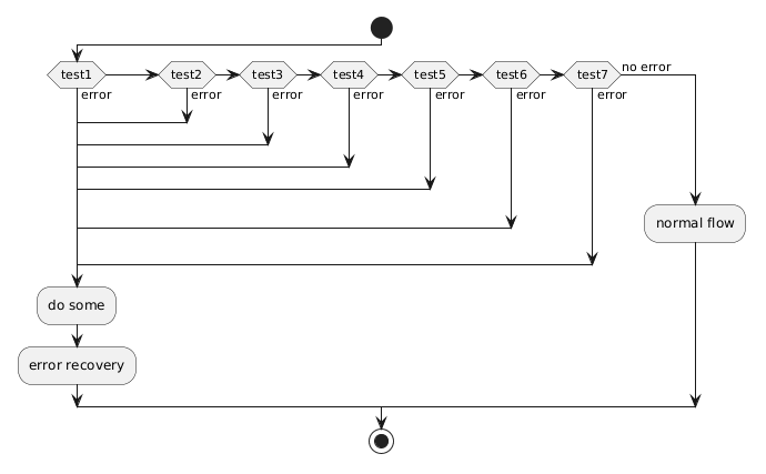 @startuml '!pragma useverticalif on start if (test1) then (error) label d0 label d1 label d2 label d3 label d4 label d5 label error :do some; :error recovery; elseif (test2) then (error) label l2 goto error elseif (test3) then (error) label d0 label d1 goto error elseif (test4) then (error) label d0 label d1 label d2 goto error elseif (test5) then (error) label d0 label d1 label d2 label d3 goto error elseif (test6) then (error) label d0 label d1 label d2 label d3 label d4 goto error elseif (test7) then (error) label d0 label d1 label d2 label d3 label d4 label d5 goto error else (no error) :normal flow; endif stop @enduml