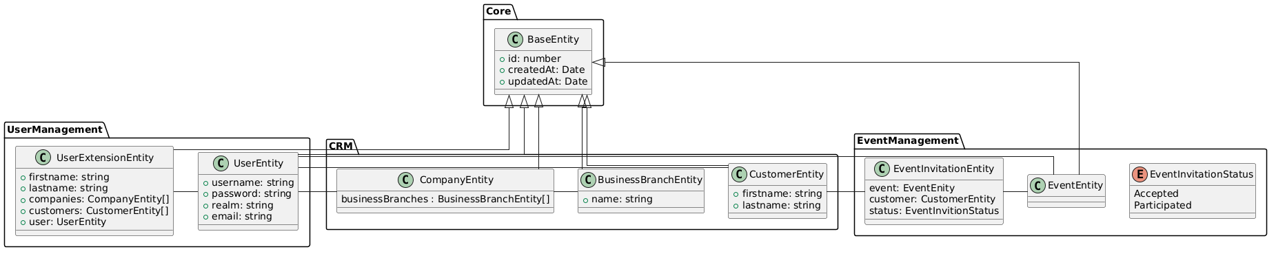 @startuml skinparam linetype ortho namespace Core { class BaseEntity { +id: number +createdAt: Date +updatedAt: Date } } namespace UserManagement { class UserEntity extends Core.BaseEntity { +username: string +password: string +realm: string +email: string } UserExtensionEntity - UserEntity class UserExtensionEntity extends Core.BaseEntity { +firstname: string +lastname: string +companies: CompanyEntity[] +customers: CustomerEntity[] +user: UserEntity } } namespace CRM { class BusinessBranchEntity extends Core.BaseEntity { +name: string } UserManagement.UserEntity - CompanyEntity CompanyEntity - BusinessBranchEntity class CompanyEntity extends Core.BaseEntity { businessBranches : BusinessBranchEntity[] } UserManagement.UserEntity - CustomerEntity class CustomerEntity extends Core.BaseEntity { +firstname: string +lastname: string } } namespace EventManagement { UserManagement.UserEntity - EventEntity class EventEntity extends Core.BaseEntity { } EventInvitationEntity - EventEntity EventInvitationEntity - CRM.CustomerEntity class EventInvitationEntity { event: EventEnity customer: CustomerEntity status: EventInvitionStatus } enum EventInvitationStatus { Accepted Participated } } @enduml