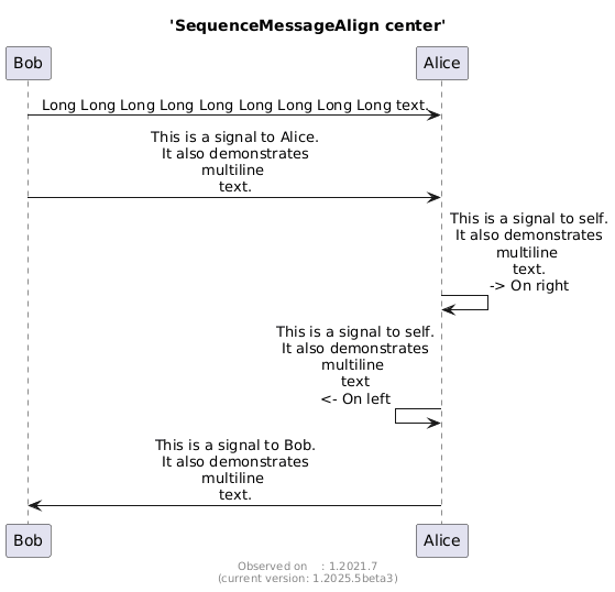 @startuml title 'SequenceMessageAlign center' skinparam SequenceMessageAlign center Bob -> Alice : Long Long Long Long Long Long Long Long Long text. Bob -> Alice : This is a signal to Alice.\nIt also demonstrates\nmultiline \ntext. Alice -> Alice: This is a signal to self.\nIt also demonstrates\nmultiline \ntext.\n-> On right Alice <- Alice: This is a signal to self.\nIt also demonstrates\nmultiline \ntext\n<- On left Bob <- Alice : This is a signal to Bob.\nIt also demonstrates\nmultiline \ntext. footer Observed on : 1.2021.7\n(current version: %version()) @enduml