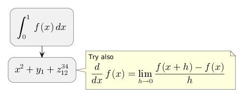 @startuml :<math>int_0^1f(x)dx</math>; :<math>x^2+y_1+z_12^34</math>; note right Try also <math>d/dxf(x)=lim_(h->0)(f(x+h)-f(x))/h</math> end note @enduml