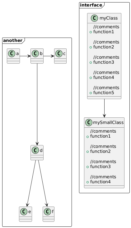 @startuml frame interface{ class myClass{ //comments +function1 //comments +function2 //comments +function3 //comments +function4 //comments +function5 } class mySmallClass{ //comments +function1 //comments +function2 //comments +function3 //comments +function4 } myClass --> mySmallClass } frame another{ a->b b->c b-->d d-->e d-->f } @enduml