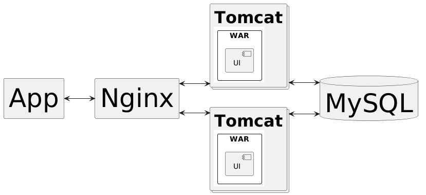 @startuml left to right direction skinparam linetype ortho rectangle "<size:50>App" as App rectangle "<size:50>Nginx" as Nginx collections Tomcat_1[ == <size:30>Tomcat {{ rectangle WAR { component UI } }} ] collections Tomcat_2[ == <size:30>Tomcat {{ rectangle WAR { component UI } }} ] database "<size:50>MySQL" as MySQL App <--> Nginx Nginx <--> Tomcat_1 Nginx <--> Tomcat_2 Tomcat_1 <--> MySQL Tomcat_2 <--> MySQL @enduml