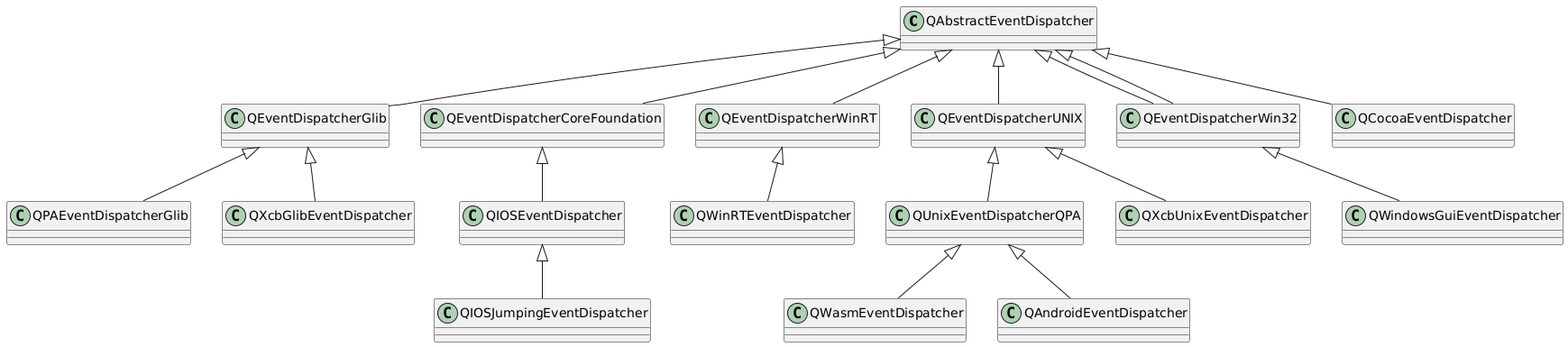 @startuml QAbstractEventDispatcher <|-- QEventDispatcherGlib QAbstractEventDispatcher <|-- QEventDispatcherCoreFoundation QAbstractEventDispatcher <|-- QEventDispatcherWinRT QAbstractEventDispatcher <|-- QEventDispatcherUNIX QAbstractEventDispatcher <|-- QEventDispatcherWin32 QAbstractEventDispatcher <|-- QEventDispatcherWin32 QAbstractEventDispatcher <|-- QCocoaEventDispatcher QEventDispatcherGlib <|-- QPAEventDispatcherGlib QEventDispatcherGlib <|-- QXcbGlibEventDispatcher QEventDispatcherCoreFoundation <|-- QIOSEventDispatcher QEventDispatcherWinRT <|-- QWinRTEventDispatcher QEventDispatcherUNIX <|-- QUnixEventDispatcherQPA QEventDispatcherUNIX <|-- QXcbUnixEventDispatcher QEventDispatcherWin32 <|-- QWindowsGuiEventDispatcher QUnixEventDispatcherQPA <|-- QWasmEventDispatcher QIOSEventDispatcher <|-- QIOSJumpingEventDispatcher QUnixEventDispatcherQPA <|-- QAndroidEventDispatcher @enduml
