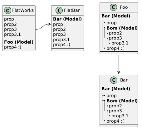 @startuml class FlatWorks { **Foo (Model)** prop prop2 prop3 prop3.1 prop4 :( } class FlatBar { **Bar (Model)** prop prop2 prop3 prop3.1 prop4 :( -- } FlatWorks::prop3 -r-> FlatBar::prop ' This doesn't work class Foo { **Bar (Model)** |_ prop |_ **Bom (Model)** |_ prop2 |_ prop3 |_ prop3.1 |_ prop4 :( -- } class Bar { **Bar (Model)** |_ prop |_ **Bom (Model)** |_ prop2 |_ prop3 |_ prop3.1 |_ prop4 :( -- } Foo::prop3 --> Bar::prop @enduml