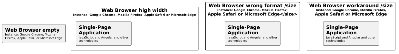 @startuml skinparam wrapWidth 200 rectangle "==Web Browser high width\n<size:10>Instance: Google Chrome, Mozilla Firefox, Apple Safari or Microsoft Edge</size>" as w1 { rectangle "==Single-Page Application\n<size:10>JavaScript and Angular and other technologies</size>" as i1 } rectangle "==Web Browser wrong format /size\n<size:10>Instance: Google Chrome, Mozilla Firefox,\nApple Safari or Microsoft Edge</size>" as w2 { rectangle "==Single-Page Application\n<size:10>JavaScript and Angular and other technologies</size>" as i2 } rectangle "==Web Browser empty\n<size:10>Instance: Google Chrome, Mozilla Firefox, Apple Safari or Microsoft Edge</size>" as w3 { } rectangle "==Web Browser workaround /size\n<size:10>Instance: Google Chrome, Mozilla Firefox,\nApple Safari or Microsoft Edge" as w4 { rectangle "==Single-Page Application\n<size:10>JavaScript and Angular and other technologies</size>" as i4 } @enduml