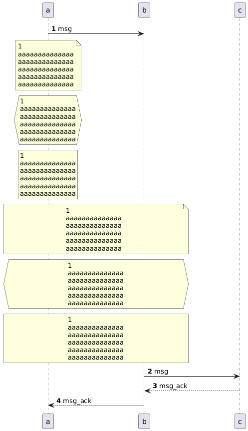 @startuml participant a participant b participant c autonumber skinparam ParticipantPadding 80 skinparam wrapWidth 30 a -> b :msg note over a : %autonumber% aaaaaaaaaaaaaa aaaaaaaaaaaaaa aaaaaaaaaaaaaa aaaaaaaaaaaaaa aaaaaaaaaaaaaa hnote over a : %autonumber% aaaaaaaaaaaaaa aaaaaaaaaaaaaa aaaaaaaaaaaaaa aaaaaaaaaaaaaa aaaaaaaaaaaaaa rnote over a : %autonumber% aaaaaaaaaaaaaa aaaaaaaaaaaaaa aaaaaaaaaaaaaa aaaaaaaaaaaaaa aaaaaaaaaaaaaa note over a,b : %autonumber% aaaaaaaaaaaaaa aaaaaaaaaaaaaa aaaaaaaaaaaaaa aaaaaaaaaaaaaa aaaaaaaaaaaaaa hnote over a,b : %autonumber% aaaaaaaaaaaaaa aaaaaaaaaaaaaa aaaaaaaaaaaaaa aaaaaaaaaaaaaa aaaaaaaaaaaaaa rnote over a,b : %autonumber% aaaaaaaaaaaaaa aaaaaaaaaaaaaa aaaaaaaaaaaaaa aaaaaaaaaaaaaa aaaaaaaaaaaaaa b -> c :msg return msg_ack a <-- b :msg_ack @enduml