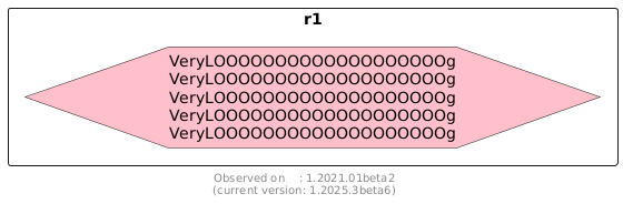 @startuml rectangle r1 { hexagon #pink "VeryLOOOOOOOOOOOOOOOOOOOg\nVeryLOOOOOOOOOOOOOOOOOOOg\nVeryLOOOOOOOOOOOOOOOOOOOg\nVeryLOOOOOOOOOOOOOOOOOOOg\nVeryLOOOOOOOOOOOOOOOOOOOg" } footer Observed on : 1.2021.01beta2\n(current version: %version()) @enduml