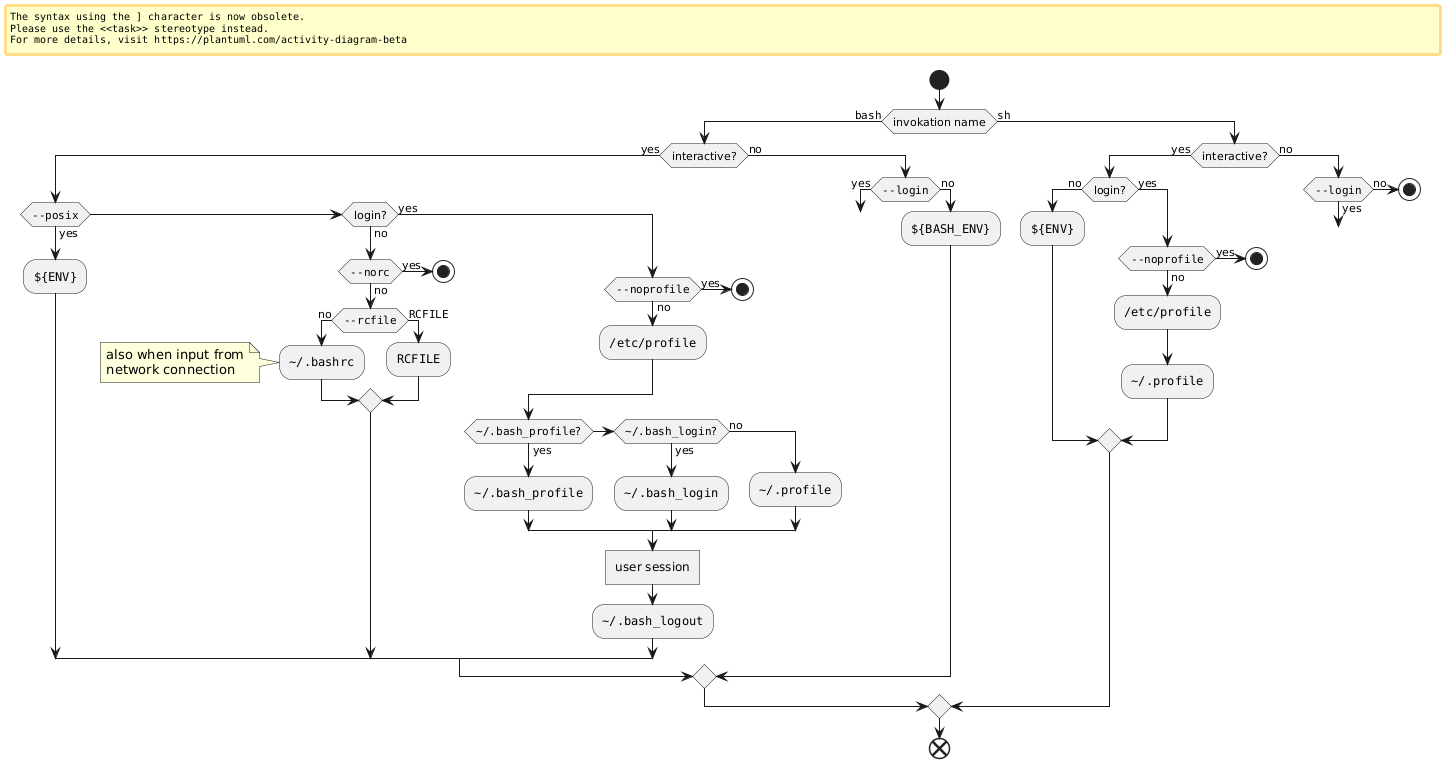@startuml start if (invokation name) then (""bash"") if (interactive?) then (yes) if(""--posix"") then (yes) :""${ENV}""; else if(login?) then (no) if(""--norc"") then (yes) stop else (no) if(""--rcfile"") then (no) :""\~/.bashrc""; note: also when input from\nnetwork connection else (""RCFILE"") :""RCFILE""; endif endif else (yes) label bash_login if(""--noprofile"") then (yes) stop else (no) :""/etc/profile""; if (""\~/.bash_profile""?) then (yes) :""\~/.bash_profile""; else if (""\~/.bash_login""?) then (yes) :""\~/.bash_login""; else (no) :""\~/.profile""; endif endif :user session] :""\~/.bash_logout""; endif else (no) if(""--login"") then (yes) goto bash_login else (no) :""${BASH_ENV}""; endif endif else (""sh"") if (interactive?) then (yes) if(login?) then (no) :""${ENV}""; else (yes) label sh_login if(""--noprofile"") then (yes) stop else (no) :""/etc/profile""; :""\~/.profile""; endif endif else (no) if(""--login"") then (yes) goto sh_login else (no) stop endif endif endif end @enduml