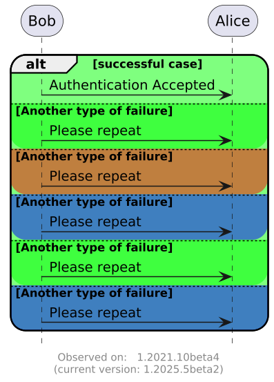 @startuml scale 1.5 hide footbox <style> sequenceDiagram { RoundCorner 30 } </style> alt #00ff0080 successful case Bob -> Alice: Authentication Accepted else Another type of failure Bob -> Alice: Please repeat else #ff000080 Another type of failure Bob -> Alice: Please repeat else #0000ff80 Another type of failure Bob -> Alice: Please repeat else Another type of failure Bob -> Alice: Please repeat else #0000ff80 Another type of failure Bob -> Alice: Please repeat end footer \nObserved on: 1.2021.10beta4\n(current version: %version()) @enduml