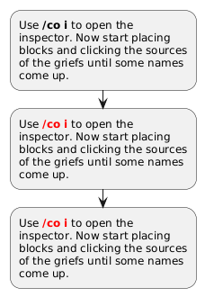 @startuml !define RB(x) <b><color:#red>x</color></b> :Use <b>/co i</b> to open the inspector. Now start placing blocks and clicking the sources of the griefs until some names come up.; :Use <b><color:#red>/co i</color></b> to open the inspector. Now start placing blocks and clicking the sources of the griefs until some names come up.; :Use RB(/co i) to open the inspector. Now start placing blocks and clicking the sources of the griefs until some names come up.; @enduml