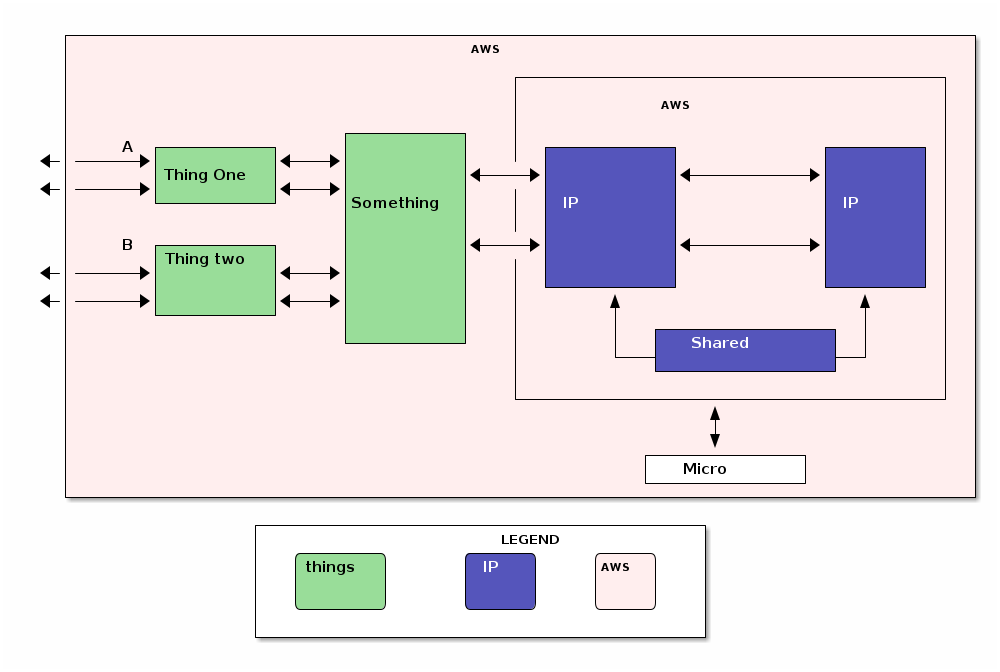 @startditaa +------------------------------------------------------------------------------------------+ | AWS | | | | +------------------------------------------+ | | | cGRE | | | | AWS | | | | | | | +-----------+ | | | | A +-----------+ | | | +------------+ +---------+ | | <-|------->+ +<---->+ | | | | | | | | | |Thing One | | +<----->+ +<------------>+ | | | <-|------->+ cGRE +<---->+ | | | | | | | | | +-----------+ |Something | | | IP | | IP | | | | | | | | | | | | | | | cGRE | | | cBLU | | cBLU | | | | B +-----------+ | +<----->+ +<------------>+ | | | | |Thing two | | | | | | | | | | <-|------->+ +<---->+ | | | | | | | | | | cGRE | | | | +------------+ +---------+ | | <-|------->+ +<---->+ | | ^ ^ | | | +-----------+ | | | | | | | | | | | | +-----------------+ | | | | +-----------+ | | | Shared | | | | | | +---+ cBLU +--+ | | | | +-----------------+ | | | | | | | +-------------------+----------------------+ | | ^ | | | | | v | | cFEE +------+--------+ | | | Micro | | | +---------------+ | +------------------------------------------------------------------------------------------+ +--------------------------------------------+ | LEGEND | | /--------\ /------\ /-----\ | | |things | | IP | |AWS | | | |cGRE | |cBLU | |cFEE | | | | | | | | | | | \--------/ \------/ \-----/ | | cFFF | +--------------------------------------------+ @endditaa