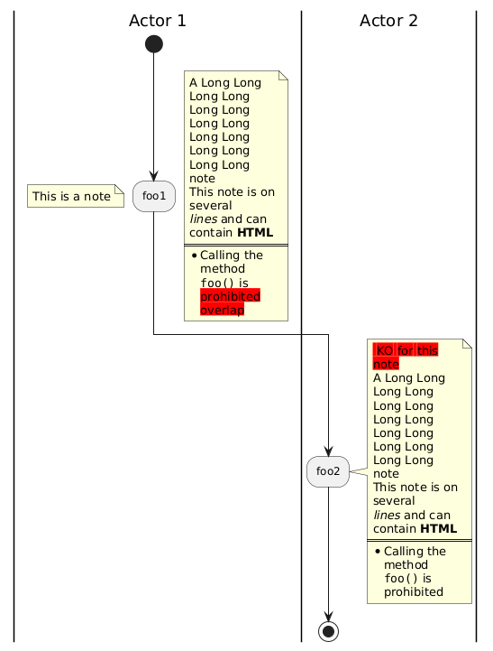 @startuml <style> activityDiagram { note { MaximumWidth 100 } } </style> |Actor 1| start :foo1; note right A Long Long Long Long Long Long Long Long Long Long Long Long Long Long note This note is on several //lines// and can contain <b>HTML</b> ==== * Calling the method ""foo()"" is <back:red>prohibited overlap end note floating note left: This is a note |Actor 2| :foo2; note right <back:red> KO for this note A Long Long Long Long Long Long Long Long Long Long Long Long Long Long note This note is on several //lines// and can contain <b>HTML</b> ==== * Calling the method ""foo()"" is prohibited end note stop @enduml