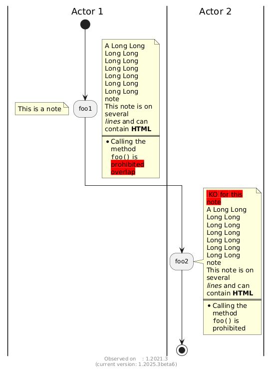 @startuml <style> activityDiagram { note { MaximumWidth 100 } } </style> |Actor 1| start :foo1; note right A Long Long Long Long Long Long Long Long Long Long Long Long Long Long note This note is on several //lines// and can contain <b>HTML</b> ==== * Calling the method ""foo()"" is <back:red>prohibited overlap end note floating note left: This is a note |Actor 2| :foo2; note right <back:red> KO for this note A Long Long Long Long Long Long Long Long Long Long Long Long Long Long note This note is on several //lines// and can contain <b>HTML</b> ==== * Calling the method ""foo()"" is prohibited end note stop footer Observed on : 1.2021.3\n(current version: %version()) @enduml