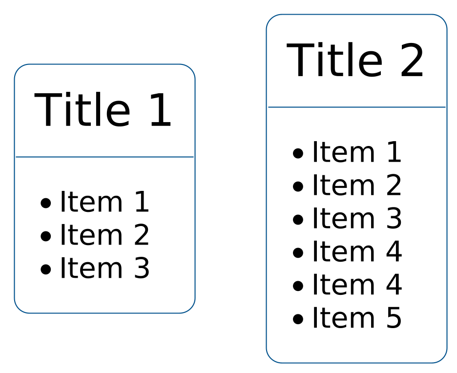 @startuml skinparam dpi 400 skinparam shadowing false skinparam backgroundcolor transparent skinparam rectangle { roundCorner 15 StereotypeFontColor #black FontColor #black BackgroundColor #FFFFFF BorderColor #00518C } rectangle "<size:22>Title 1</size>\n<size:1><font color=white>invisible-vertical-spacing</size>\n____\n<size:1><font color=white>invisible-vertical-spacing</size>\n* Item 1\n* Item 2\n* Item 3"{ } rectangle "<size:22>Title 2</size>\n<size:1><font color=white>invisible-vertical-spacing</size>\n____\n<size:1><font color=white>invisible-vertical-spacing</size>\n* Item 1\n* Item 2\n* Item 3\n* Item 4\n* Item 4\n* Item 5"{ } @enduml